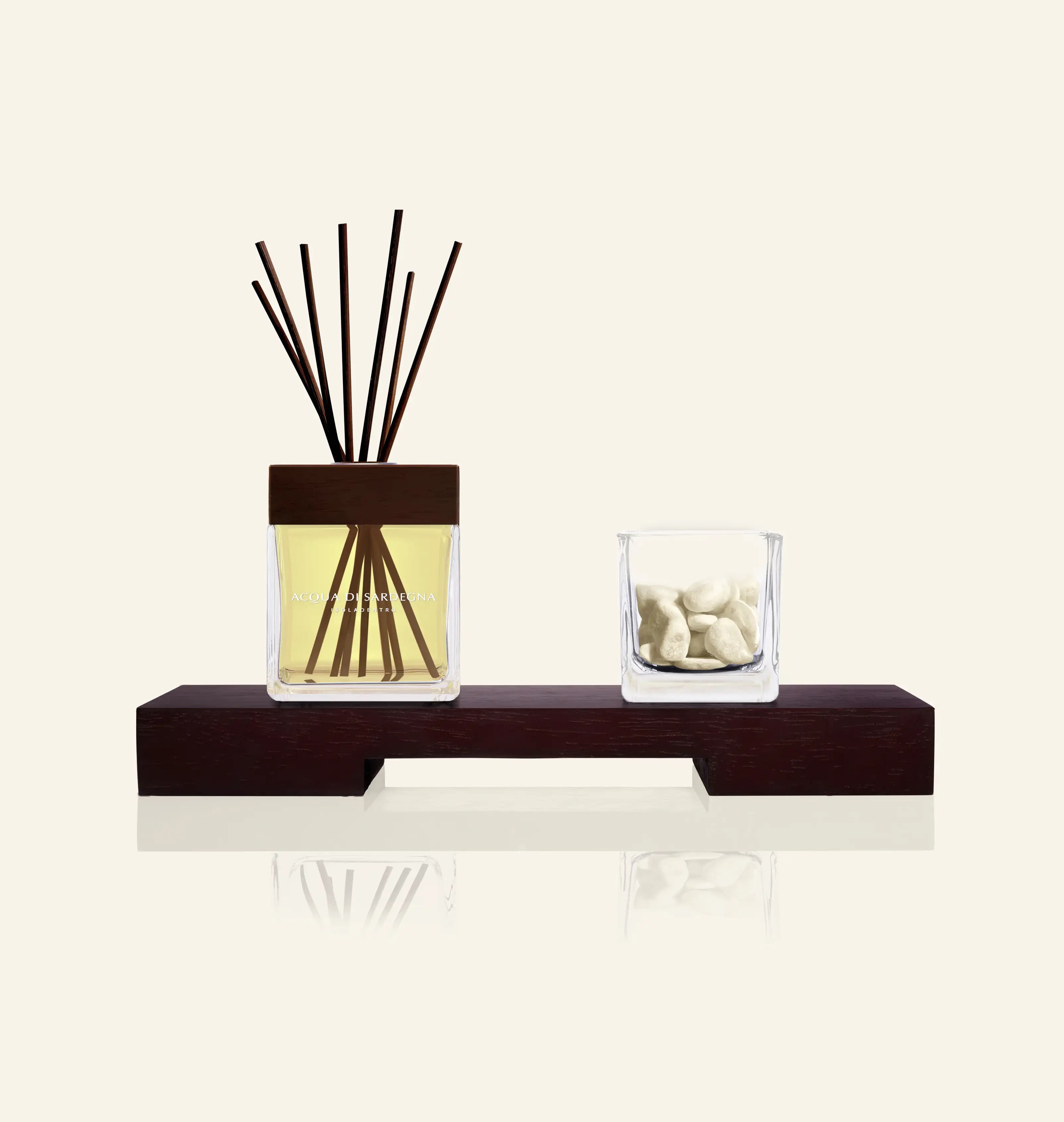 Der Diffusor steht auf einem Tablett aus dunklem Holz, daneben glänzt ein Glas, das mit kleinen weißen Duftsteinen verziert ist. Eine kleine, elegante Komposition, die die Natur unserer Insel schmückt und heraufbeschwört.